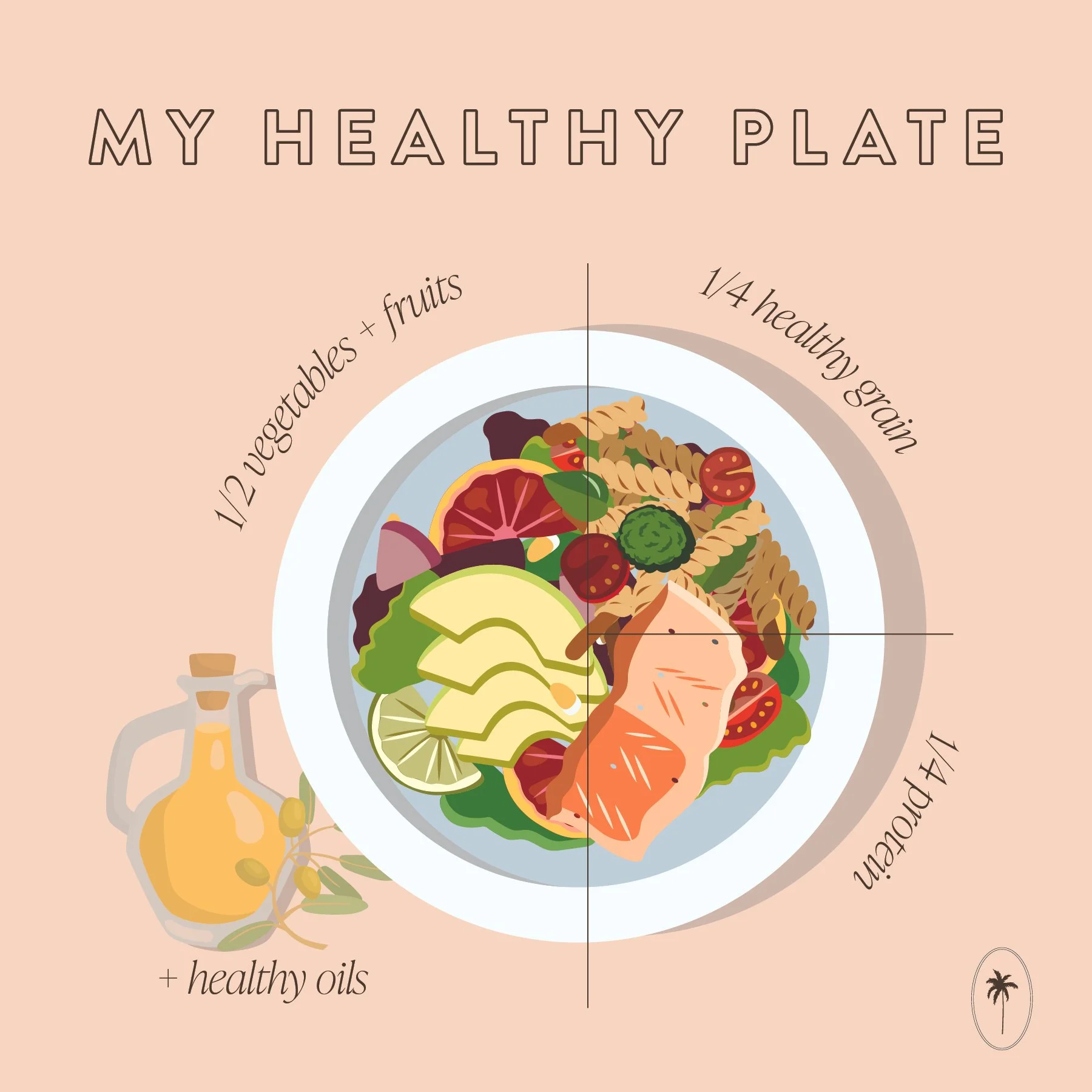 This is a great visual model for nutrition guidance! This plate includes vegetables, fruits, whole grains, healthy protein, and healthy oils (think EVOO or Avo oil!) Please note that specific dietary requirements or medical conditions can influence what your “healthy plate” looks like - please always consult your doctor prior to making any changes to your diet.